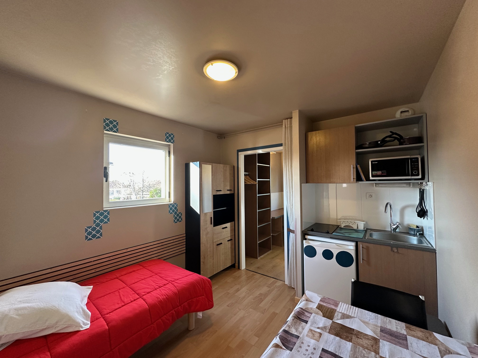 Venez découvrir ce beau studio entièrement rénové et meublé avec goût, situé au sein d’une résidence sécurisée avec gardien. Le studio est en excellent état avec une pièce principale fonctionnelle et lumineuse. Elle se compose d’une entrée avec un coin nuit et literie neuve, d’une kitchenette équipée (plaque de cuisson, réfrigérateur table top, micro-ondes et machine à café), d’une salle d’eau avec vasque, douche et WC, ainsi que d’un espace bureau avec dressing. De nombreux rangements sont également disponibles. Le studio bénéficie également d’une double porte, comprenant une porte d’entrée et une porte de sécurité, offrant un confort et une tranquillité supplémentaires. Chauffage et eau chaude électriques. Au sein de la résidence, vous bénéficierez de nombreux équipements tels qu’une salle de travail avec wifi, une laverie avec machines à laver et sèche-linge, un parking commun et un local à vélos.